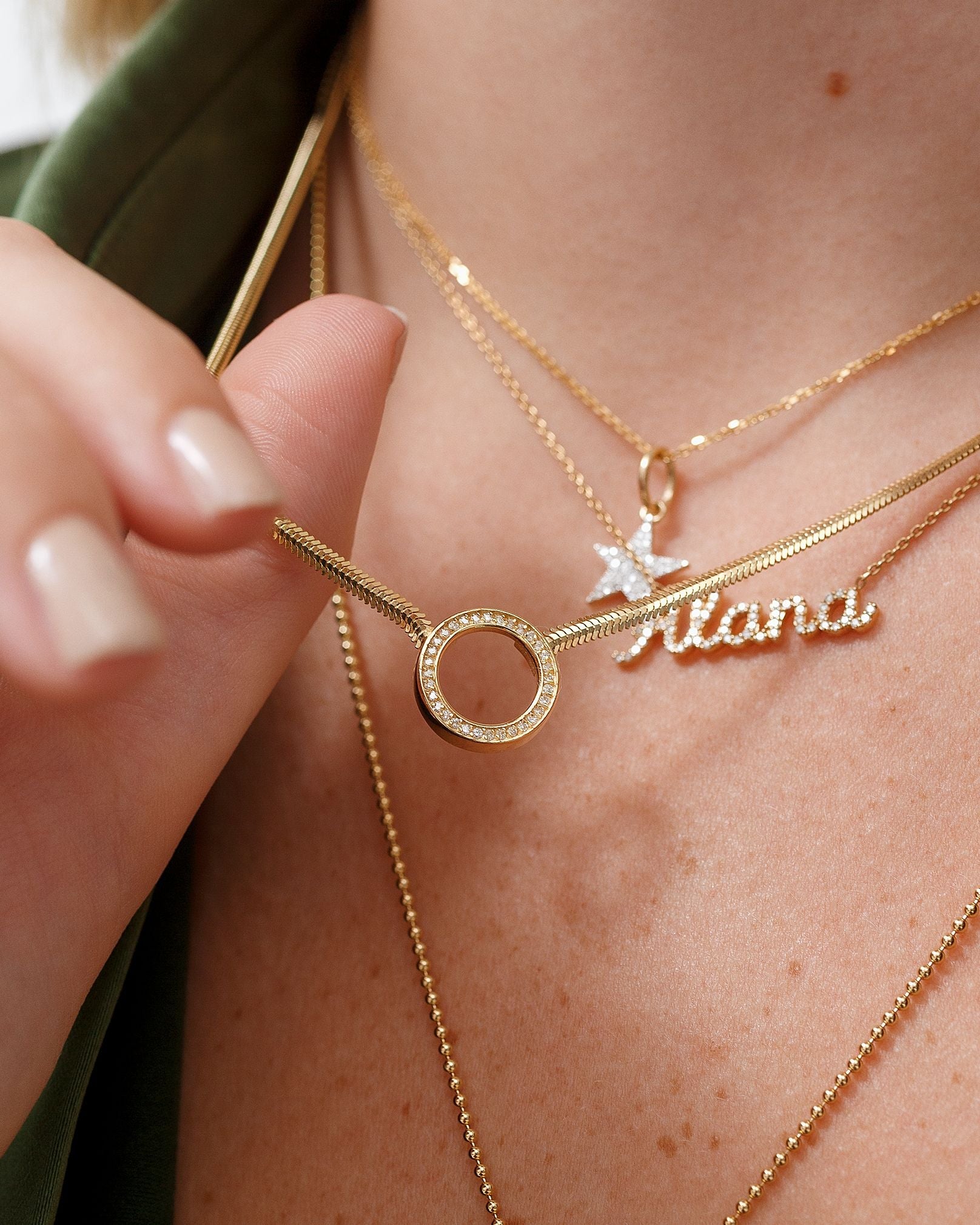 Unleash your wild side with our Diamond Circle Snake Chain Necklace. This rare and unique piece adds a touch of elegance to any outfit, while the pave circle pendant radiates timeless charm. Dare to be different and make a statement with this versatile necklace.