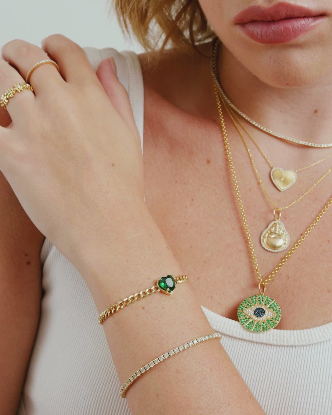 A gold thick design that matches your delicate wrist. A lovely single heart gemstone lays in a gold cuban bracelet, a mix of both bold and sweet.