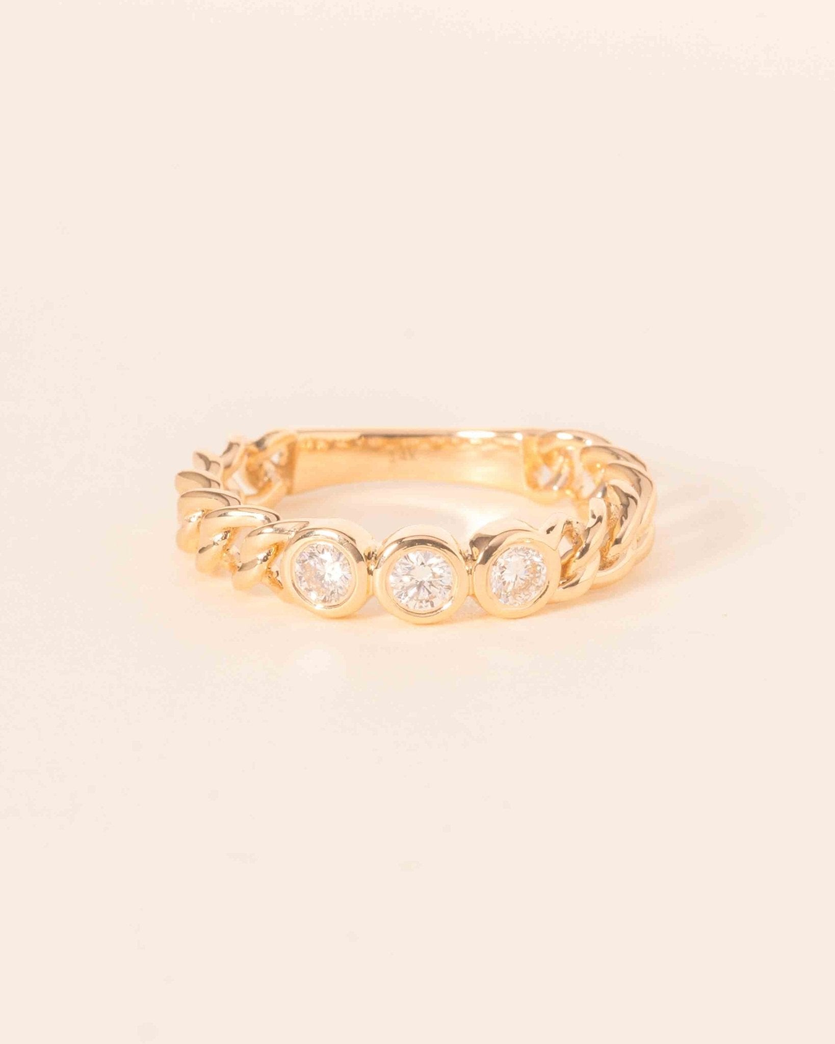 Three diamond bezels are the lead of the ring. The gold cuban link gives texture and a whole retro vibe to the piece. A must-have addition to any good stack.